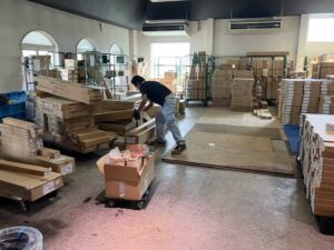 現場から戻った資材や廃材を片づけたり、戻したりします。数の確認もあります。出荷も確認をします。